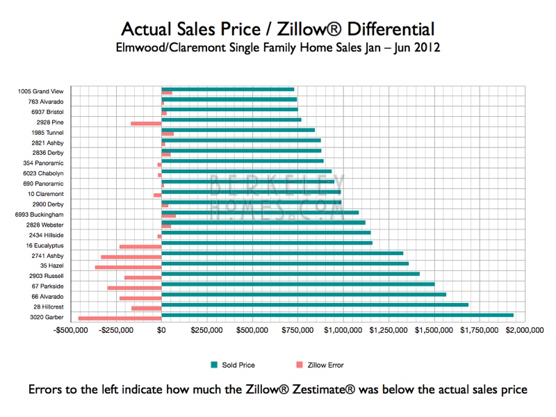 This graph shows how the Zillow® Zestimate® compared to the actual sales prices. The data is from 4 different Berkeley Neighborhoods - Thousand Oaks, Berkeley Hills, North Berkeley & Elmwood Claremont. The neighborhood charts are shown in the next section.
